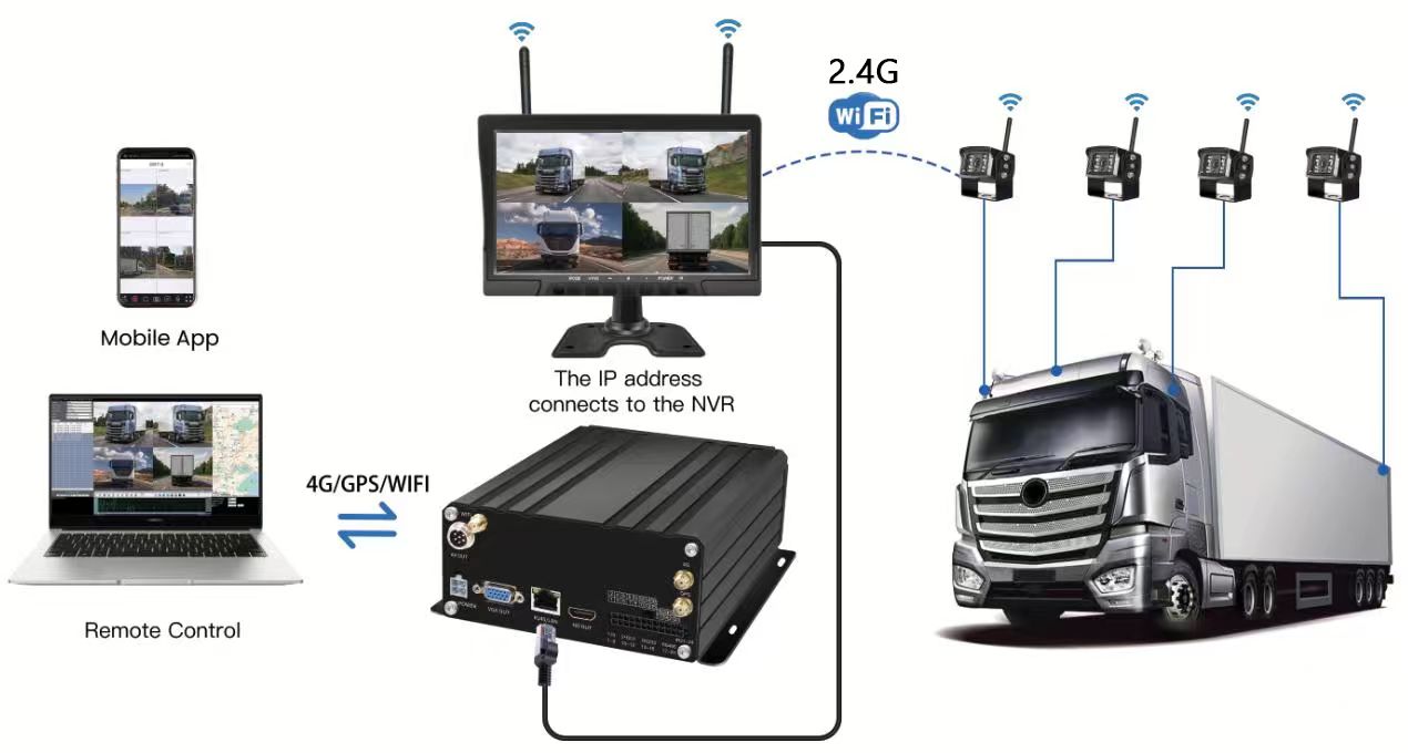 Caméra de surveillance du conducteur AHD dans la cabineSystème NVR mobile avec disque dur sans fil Carleader 10,1 pouces 4CH, un système NVR mobile de pointe conçu pour la gestion de flotte. Le système utilise 4 caméras IP sans fil couplées à un moniteur sans fil de 10,1 pouces via un signal de 2,4 GHz, puis connectez le moniteur et le NVR avec un connecteur RJ45. pas besoin de problème de câblage supplémentaire, plus efficace pour l'installation et la gestion de flotte.