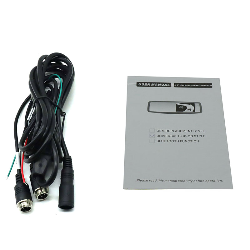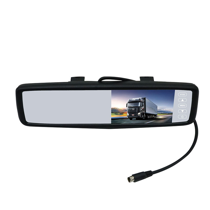 Clip couleur TFT de 4,3 pouces sur le moniteur de rétroviseur de voiture avec 5 boutons tactiles droits etil y a 2 façonsEntrées AV pour vue arrière.AV1 par défaut a des images et AV2 avec fil de déclenchement, passage automatique à la caméra de recul lors du déclenchement du fil de déclenchement AV2.