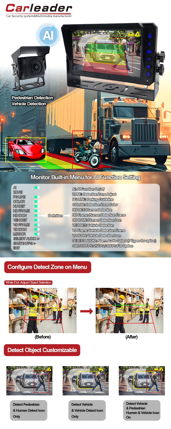 Caméra de surveillance du conducteur AHD dans la cabineLe système de surveillance de détection d'angle mort AI BSD de 7 pouces Carleader prend en charge l'étalonnage AI est conçu avec des algorithmes AI avancés de haute précision et un fonctionnement convivial du menu CZ. Ce système de caméra AI fournit aux conducteurs des avertissements dynamiques de haute précision pour les piétons et les véhicules par tous les temps, réduisant ainsi efficacement le risque d'accidents de la route. Le système de caméra de surveillance AI convient aux voitures privées, aux flottes commerciales et aux véhicules spéciaux. Le système d'IA de flotte présente de fortes capacités d'intégration et de compatibilité, de durabilité et de surveillance en temps réel.