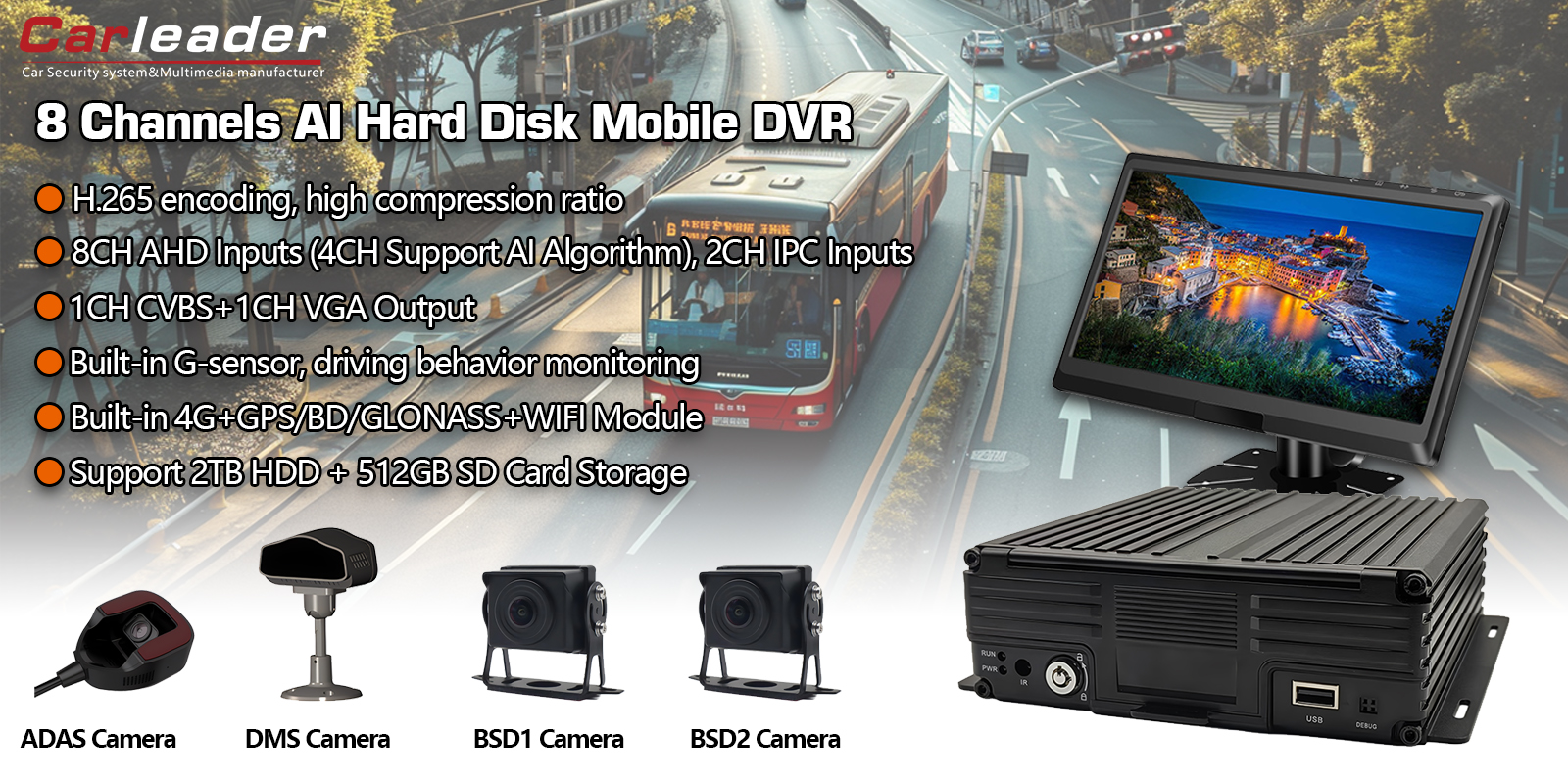 Présentation de CarleaderDVR mobile avec disque dur AI 8 canaux prenant en charge ADAS + DMS + BSD, un enregistreur vidéo numérique haut de gamme à disque dur à 8 canaux conçu pour la surveillance professionnelle des véhicules et la gestion intelligente de la flotte. Combinant une conception matérielle robuste avec des algorithmes d'IA avancés, notamment ADAS, DSM, BSD. Il offre un enregistrement vidéo fiable et de haute qualité, une assistance complète à la conduite et une surveillance proactive de la sécurité, le tout dans un système unique et intégré.