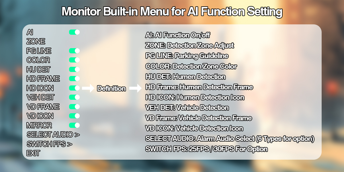 Surveiller le menu d'étalonnage AI intégré, tousLes utilisateurs peuvent ajuster librement la taille de la zone de détection (zone de détection) sur l'écran pour s'adapter à différentes situations de visualisation causées par différentes positions et angles d'installation. Outre le réglage de la zone de détection, il existe d'autres fonctions AI qui permettent à l'utilisateur de modifier les paramètres (veuillez vérifier l'image suivante).