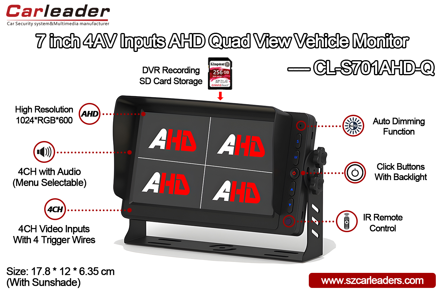 Moniteur d'affichage Carleader 7 pouces 4CH AHD entrées Quad View, les 4 canaux de caméra, chacun avec fonction audio, en mode quad view, peuvent sélectionner quel canal avec audio dans le menu ; et en mode vue unique, chaque canal avec fonction audio. Tous les boutons avec rétroéclairage disposent de deux types de boutons en option, bouton clic et bouton tactile.