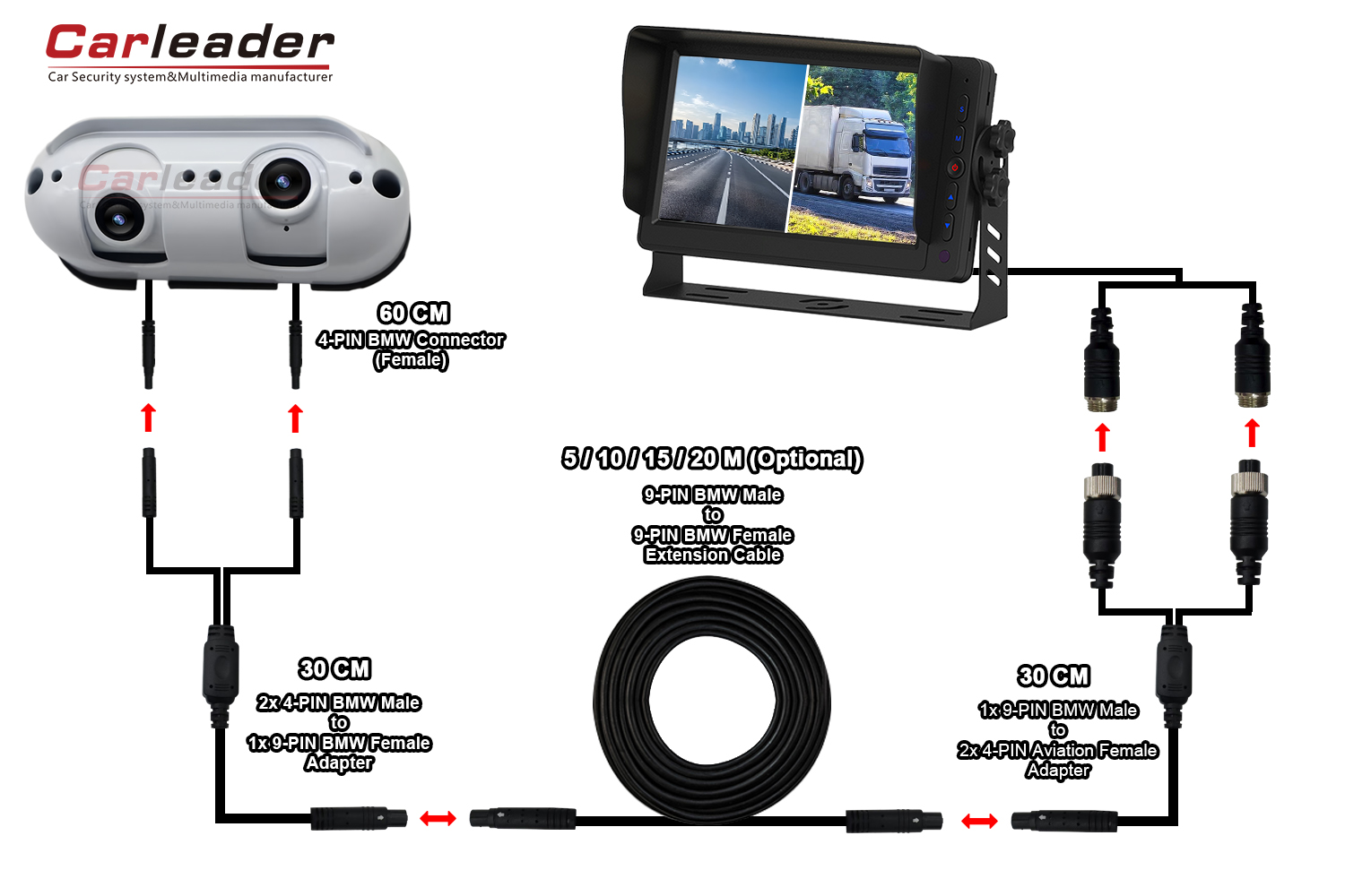 La première solution utilise uniquement un câble d'extension (connecteur BMW à 9 broches), 1 à 2 câbles divisés aux deux extrémités pour connecter la caméra et le moniteur. Parce que cette solution utilise uniquement un câble d'extension, ce qui rend le processus de câblage plus facile et plus pratique.