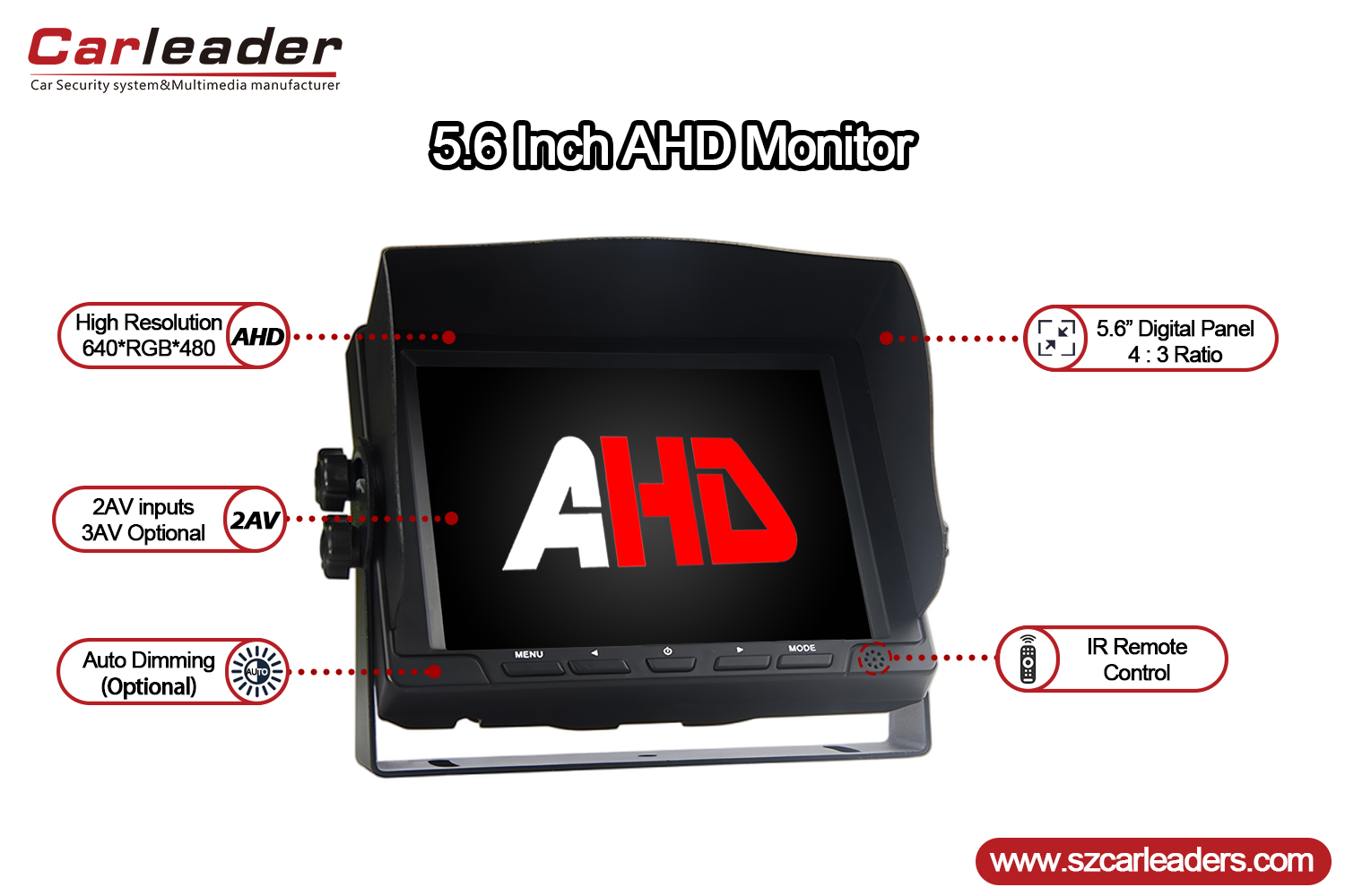 Leader automobileMoniteur de sauvegarde de véhicule à entrées AHD 2 canaux de 5,6 poucesest un 5,6 pouces de qualité professionnelleMoniteur de vue arrière AHD, conçu pour fournir une image claire et fiable des systèmes de sécurité et de surveillance des véhicules. Doté d'un design moderne et d'une fonctionnalité robuste, c'est une solution idéale pour les véhicules commerciaux et privés nécessitant une vision arrière fiable.