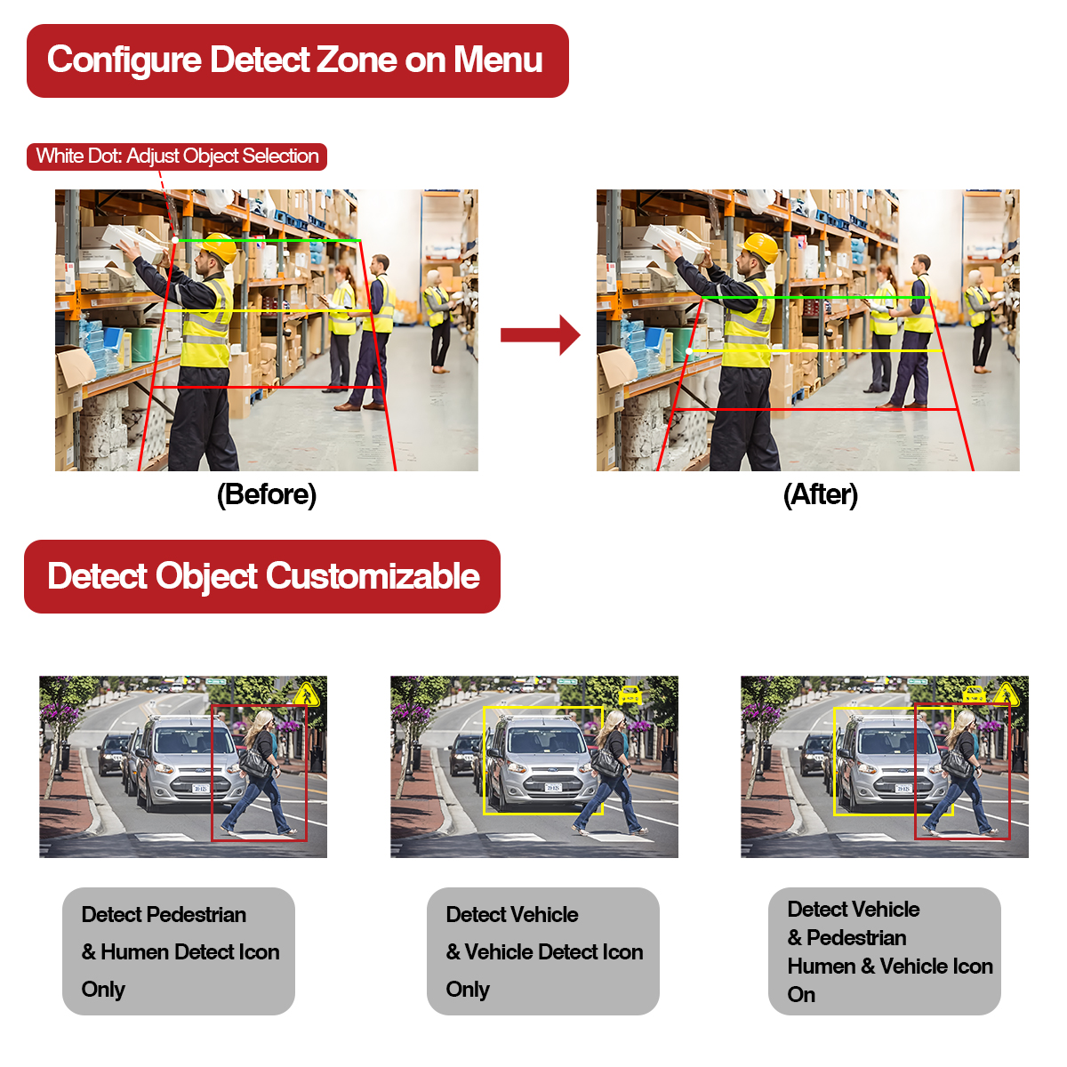 Carleader AI Détection d'angle mort Caméra de recul L'alarme sonore et lumineuse intégrée peut fonctionner seule sans connexion au moniteur comme capteur d'alarme, et peut également fonctionner avec notre moniteur AI qui peut être ajusté divers étalonnages AI, tels que le réglage de la zone de détection, le type d'alarme, l'icône de détection ON'OFF, etc.