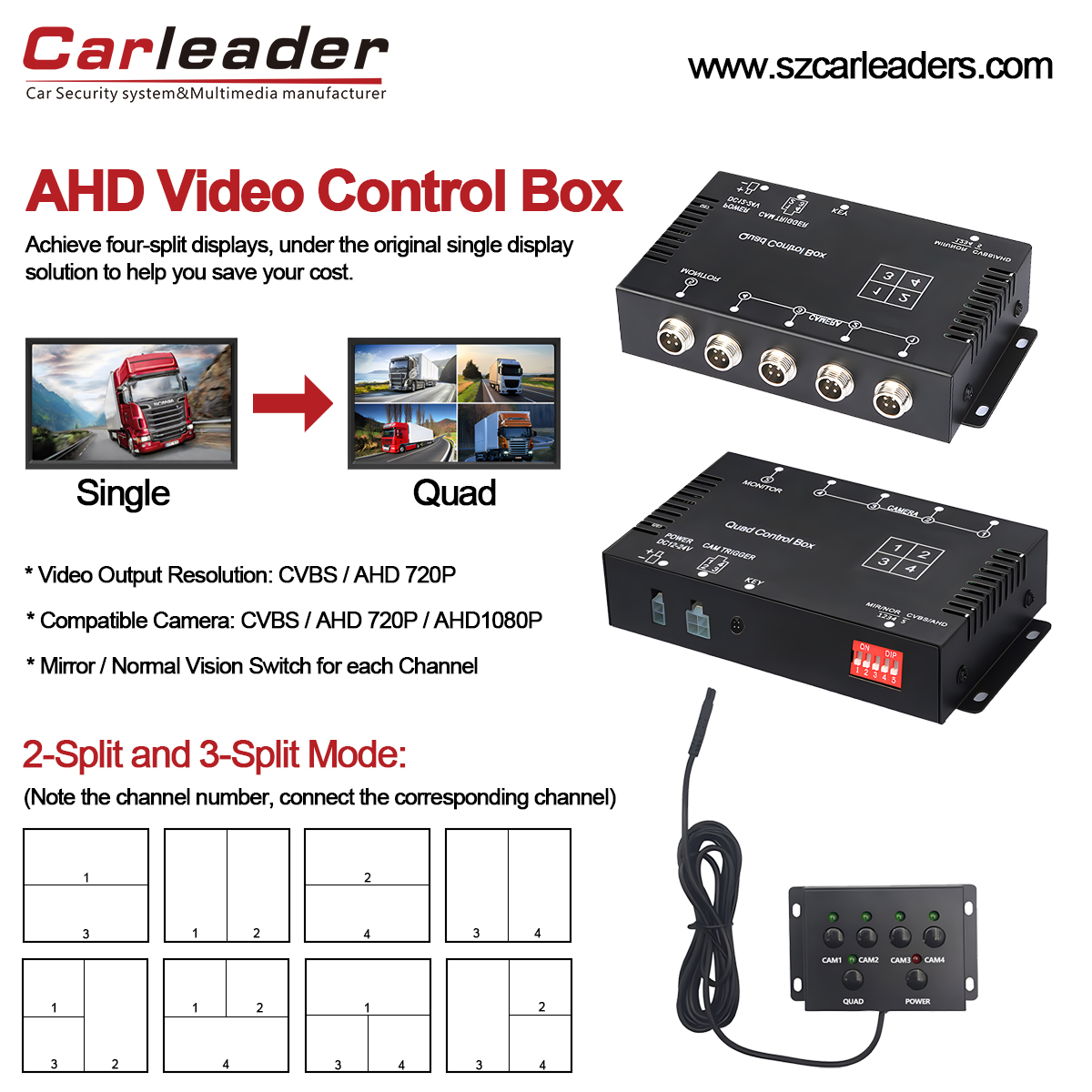 Parlons de ce que vous devez savoir sur CarleaderProcesseur vidéo AHD Quad View Split Boxpour les véhicules lourds. Le boîtier de commande AHD quad split est un dispositif important pour un système de surveillance CCTV de véhicule. Le boîtier de commande vidéo divisé pour camion de bus prend en charge la transformation d'un seul moniteur en un moniteur à quatre vues et peut se connecter à 4 caméras de voiture AHD. Ce qui suit est une explication détaillée des fonctions, des caractéristiques et des cas d'utilisation typiques du boîtier de commande vidéo de la caméra de recul AHD.