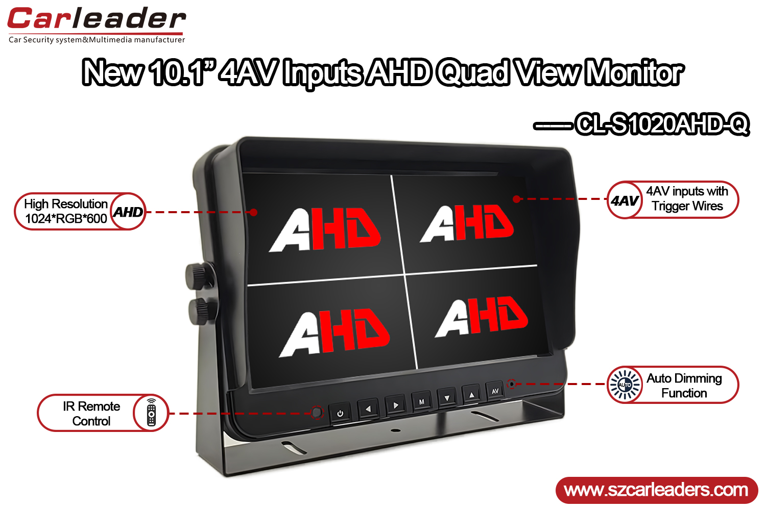 Idéal pour les applications de surveillance des véhicules, de la sécurité et de l'industrie,Moniteur AHD pour véhicule lourd à affichage quadruple Carleader 10,1 pouces 4CHcombine des fonctionnalités robustes, une qualité d'affichage claire et des options configurables par l'utilisateur dans un boîtier compact et durable.