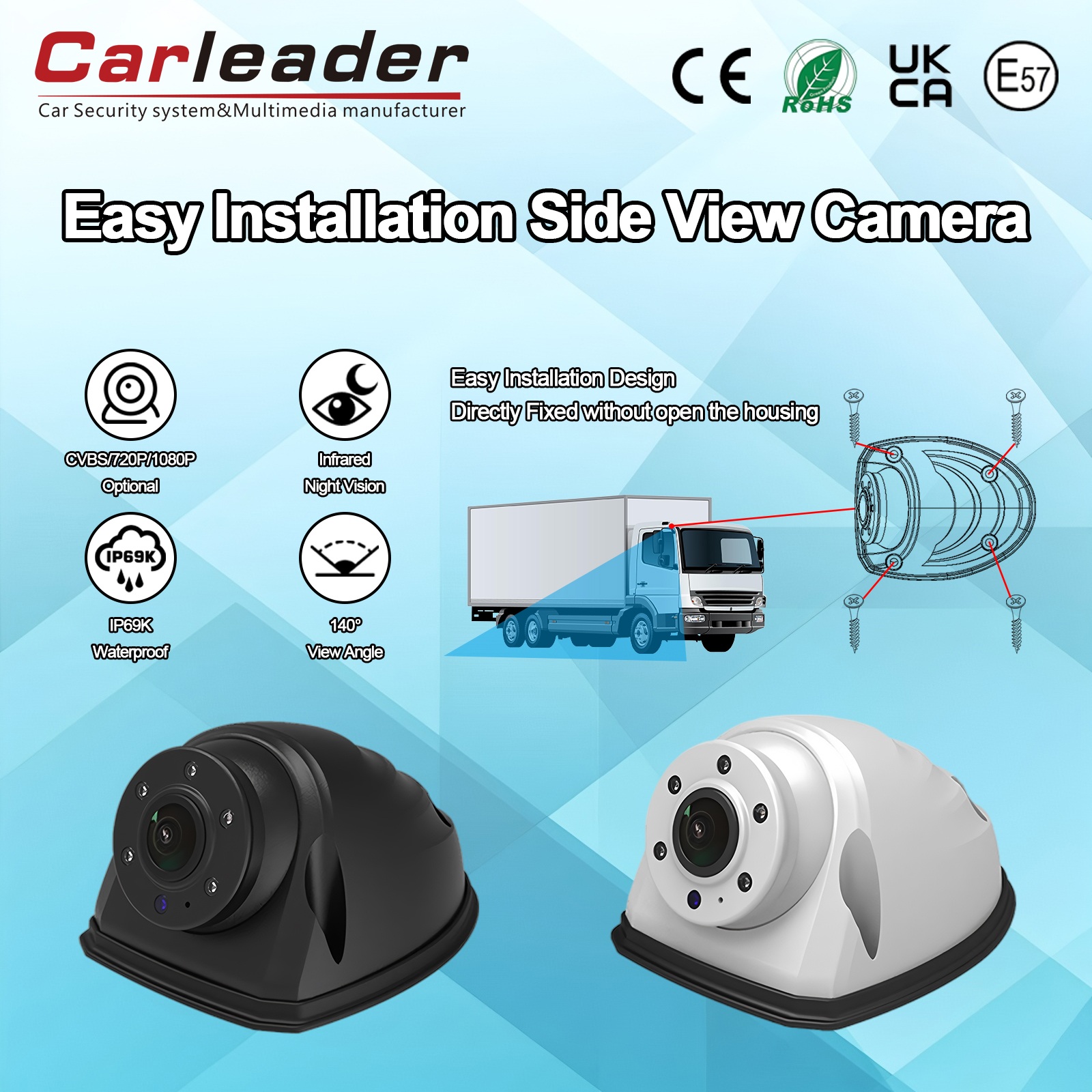 Combinant un grand angle de vision, d'excellentes performances en basse lumière et un excellent indice IP69K, la caméra de vue latérale robuste Carleader Carleader AHD à installation rapide blanche offre une conscience visuelle fiable là où d'autres caméras échouent. Sa flexibilité opérationnelle, y compris les options de tension et le montage rotatif, garantit une intégration transparente dans divers systèmes, améliorant ainsi la sécurité et l'efficacité opérationnelle dans les conditions les plus difficiles.