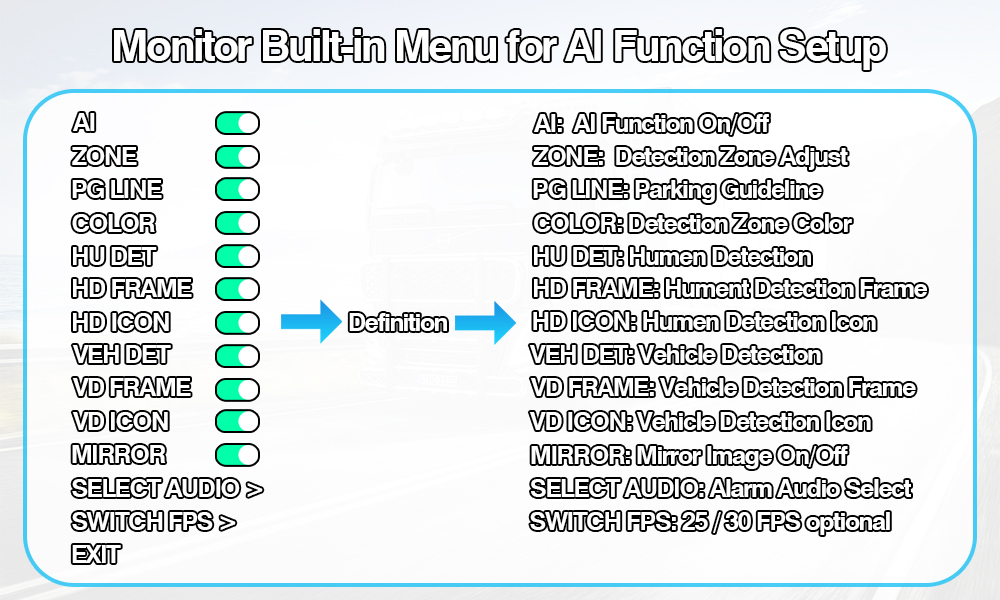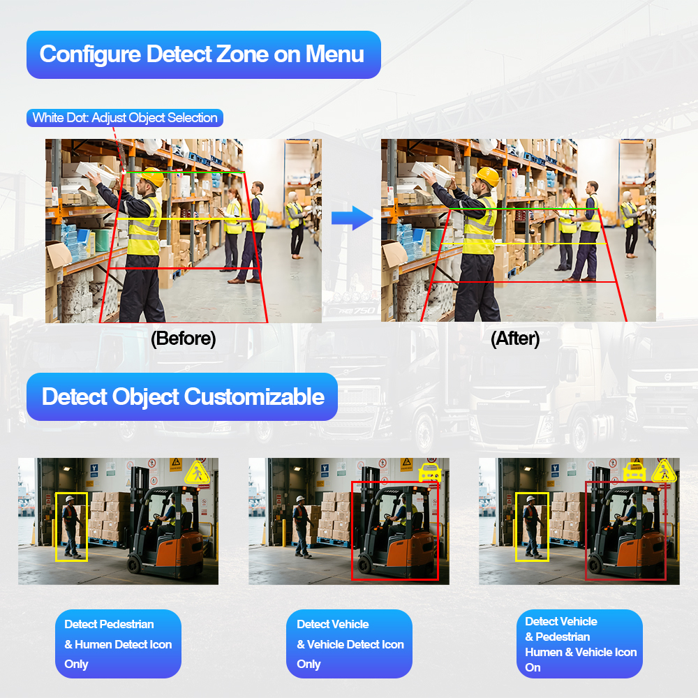 Calibrage de l'IA personnalisable : ajustez facilement les zones de détection de l'IA via le menu intuitif à l'écran du moniteur. Vous pouvez également choisir de surveiller uniquement les piétons, les véhicules uniquement ou les deux, avec un cadre de détection sélectionnable marche/arrêt et des superpositions d'icônes d'objet (piéton ou véhicule) pour un retour visuel clair.